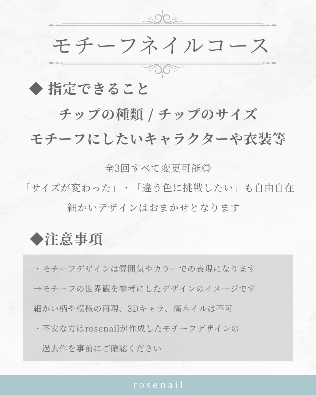 ・モチーフネイルコースをご利用の方で、期間内にデザインのご連絡がない場合は「おまかせデザイン」で制作いたします。